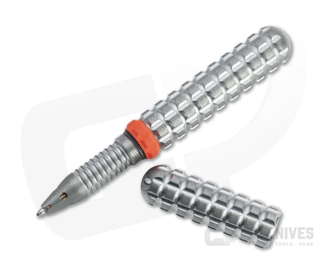 Finnish company Audacious Concept delivers a simple and rugged writing utensil in the Tenax Pen. The screw top has a hole for lanyard or key ring attachment making carry convenient. The titanium body is durable and corrosion resistant with a bright PMMA ring for easy identification and aggressive frag knurling for a sure grip. A blue glow dot insert opposite the cap makes low-light indexing a breeze. This version has an orange ring and stonewashed body.