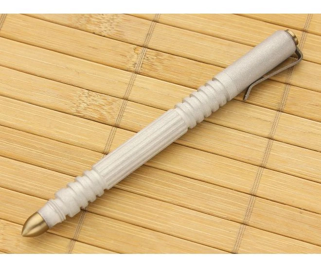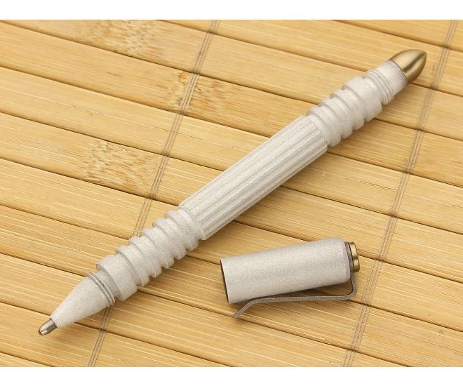 The Hinderer Aluminum Investigator Ink Pen is a compact and lightweight pen right at home in a professional setting. The Investigator was strategically built to have a small, unassuming stature while still offering a reasonable grip for striking situations, should one arise. Deep grooves around the front and back end combined with understated longitudinal grooves in the middle provides just the right amount of purchase for everyday writing tasks or less frequent striking motions. Built with modular construction, the bronze anodized small bullet attachment can be removed to refill ink and replaced with one of Hinderer’s accessory options, such as the warhead or flat end attachment. Attractive blasted raw aluminum finish with bronze titanium accenting hardware. Stainless steel clip attached and screw on cap help to keep this pen with it’s person. Black Ink. Brand new directly from Hinderer Knives.
