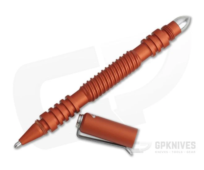 The Hinderer Knives Investigator Modular Pen with Black Ink is crafted from Matte Orange Anodized, CNC machined Aluminum with Spiral milling on the body for a great feel and added traction in the hand. This is one battle-tough pen that will handle all your every day writing tasks while maintaining a high-speed, low-drag profile.