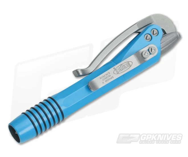 The Siphon II Ink Pen from Microtech Knives is an innovative office assistant with working lever operation. This writer has a stainless steel body with a light blue coated finish and silver accents. It’s a conveniently sized (just under 4″ closed) package that expands into a comfortable utensil.