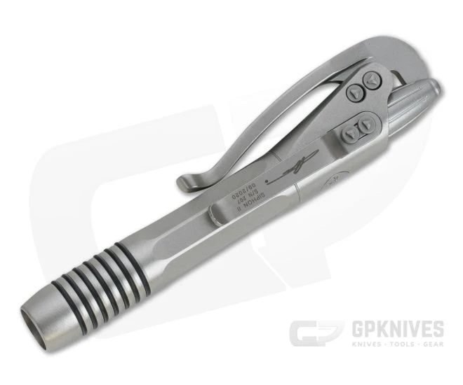 The Siphon II Ink Pen from Microtech Knives is an innovative every day carry pen with unique lever operation. This finely crafted writing tool has a stainless steel body with a bead blast finish that delivers a uniform matte gray look perfect for “Gray Man” EDC. It’s a conveniently sized (just under 4″ closed) package that expands into a comfortable utensil. This Signature Series version is adorned with an engraved Microtech Claw logo on the body.